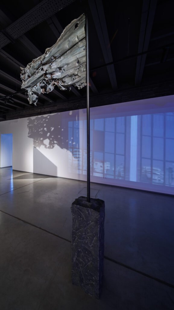 Rzeźby Nikity Kadana, nawiązujące do wizerunków flagi, tworzą serię prac, która nieustannie się rozwija i poszerza od początku rosyjskiej agresji na Ukrainę w 2014 roku. Od tego czasu artysta pracuje z materiałami naznaczonymi lub przekształconymi przez wojnę — stopionymi w wybuchach, rozerwanymi falą uderzeniową, przeszytymi pociskami. Ta brutalna materia staje się podstawą „flag” Kadana: prac, które są zarazem obiektami znalezionymi (found objects), jak i materialnymi dowodami w sprawie samej wojny, która wciąż trwa.