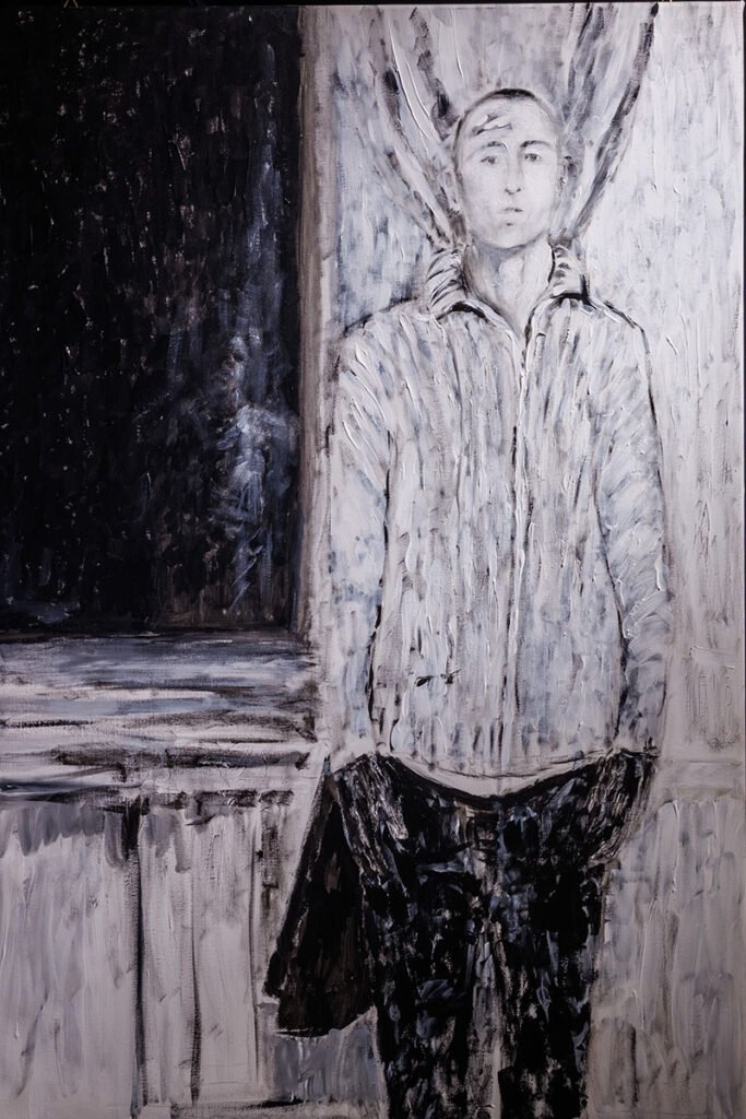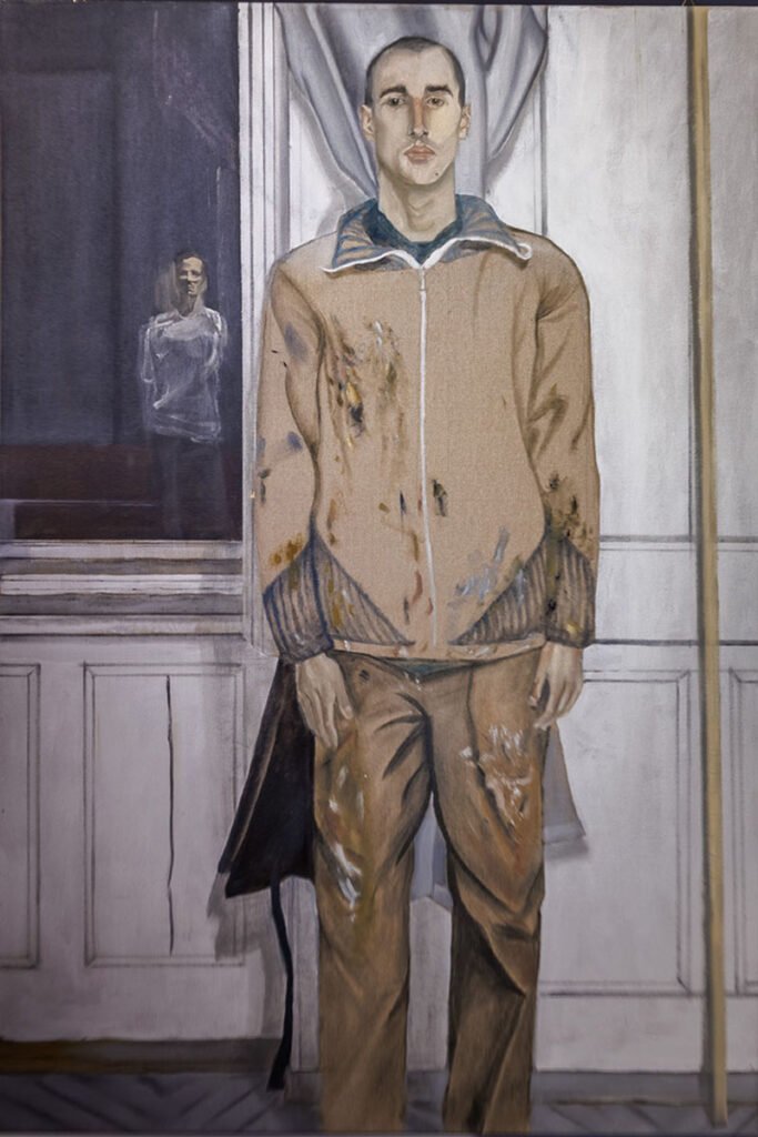 W ostatnich latach – a zwłaszcza od momentu przeprowadzki z rodzinnego Mariupola do Kijowa – Vasyl Tkachenko koncentruje się na malarstwie figuratywnym. Jego praktyka artystyczna obejmuje jednak także film i fotografię. Również Tatarczuk sięgnął po aparat. Punktem wyjścia dla współpracy obu twórców stało się zdjęcie wykonane w pracowni Tkachenki. Na pierwszym planie widnieje sylwetka malarza, w oknie zaś, tuż za nim, dostrzec można odbicie samego Tatarczuka. Artyści postanowili, że na podstawie tej fotografii każdy z nich stworzy własny obraz – podwójny (auto)portret. To gest otwierający dialog między dwoma spojrzeniami, zapis spotkania rozgrywającego się w obrębie jednego wizerunku.